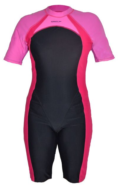 Black Speedo Burkini with pink short sleeves, short legs, and pink side panel